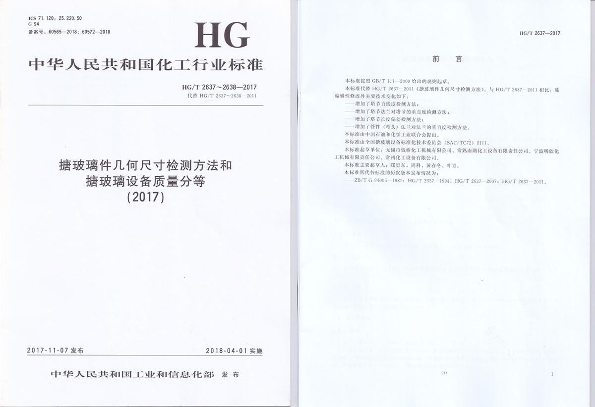 Wuxi Qianqiao Chemical Machinery Co., Ltd. participated in the drafting of the people's Republic of China chemical industry standard Hg / T 2637-2017 detecting methods of geometry dimension for glass-lined parts.