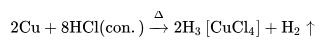 銅在無(wú)空氣時(shí)難溶于稀鹽酸,但其能溶于熱濃鹽酸中,放出氫氣: