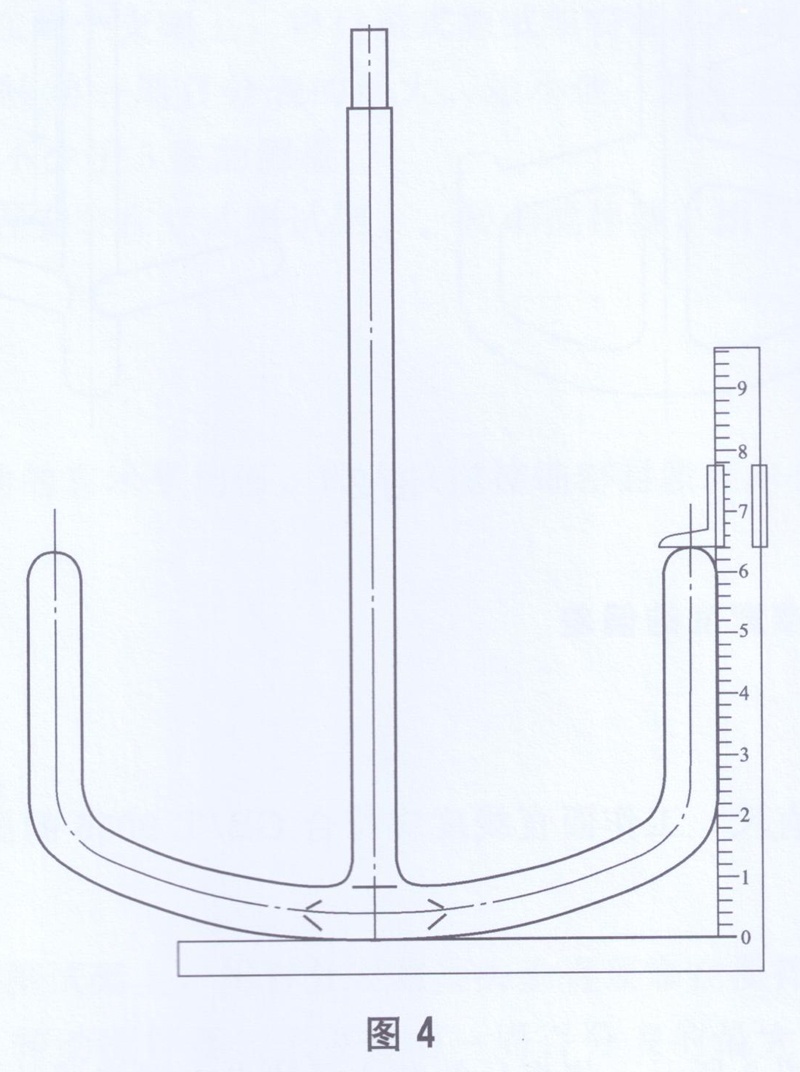 將待測(cè)攪拌器放平,如圖4所示,將直角尺的長(zhǎng)邊和短邊緊貼在攪拌器錨翼上,移動(dòng)滑塊到攪拌器錨翼端點(diǎn),在長(zhǎng)邊上讀出攪拌器錨翼的高度,取攪拌器兩個(gè)錨翼的高度平均值與標(biāo)準(zhǔn)高度之差的絕對(duì)值作為攪拌器錨翼高度與標(biāo)準(zhǔn)高度的偏差。