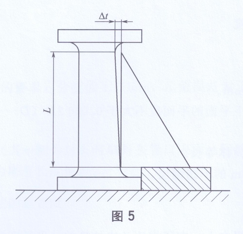 將被測管子法蘭端放置在平臺(tái)上,在緊靠法蘭邊處墊放一平行度標(biāo)準(zhǔn)圓墊塊,用直角尺貼靠在管壁上(如圖5所示),旋轉(zhuǎn)管子,用塞尺量取旋轉(zhuǎn)一周中管子上端與直角邊的最大距離△t,此值即為管件法蘭對管子的垂直度。