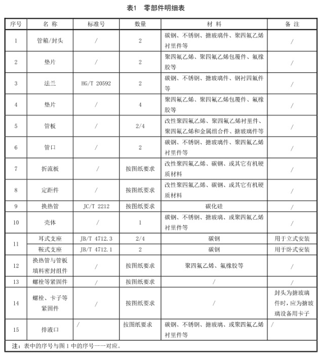 碳化硅換熱器結(jié)構(gòu)型式見(jiàn)圖1,零部件明細(xì)表見(jiàn)表1,換熱器主要尺寸標(biāo)注圖見(jiàn)圖2,主要尺寸表見(jiàn)表2,管口尺寸表見(jiàn)表3,換熱器(換熱管外徑為Φ14 mm)的布管數(shù)及換熱面積表見(jiàn)表4,換熱器(換熱管外徑為Φ19 mm)的布管數(shù)及換熱面積表見(jiàn)表5。