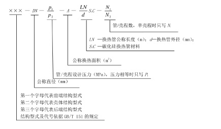 碳化硅換熱器設(shè)備型號(hào)由結(jié)構(gòu)型式、公稱直徑、設(shè)計(jì)壓力、公稱換熱面積、公稱長度、換熱器外徑、管/殼程數(shù)、管束等級(jí)等字母代號(hào)組合表示。