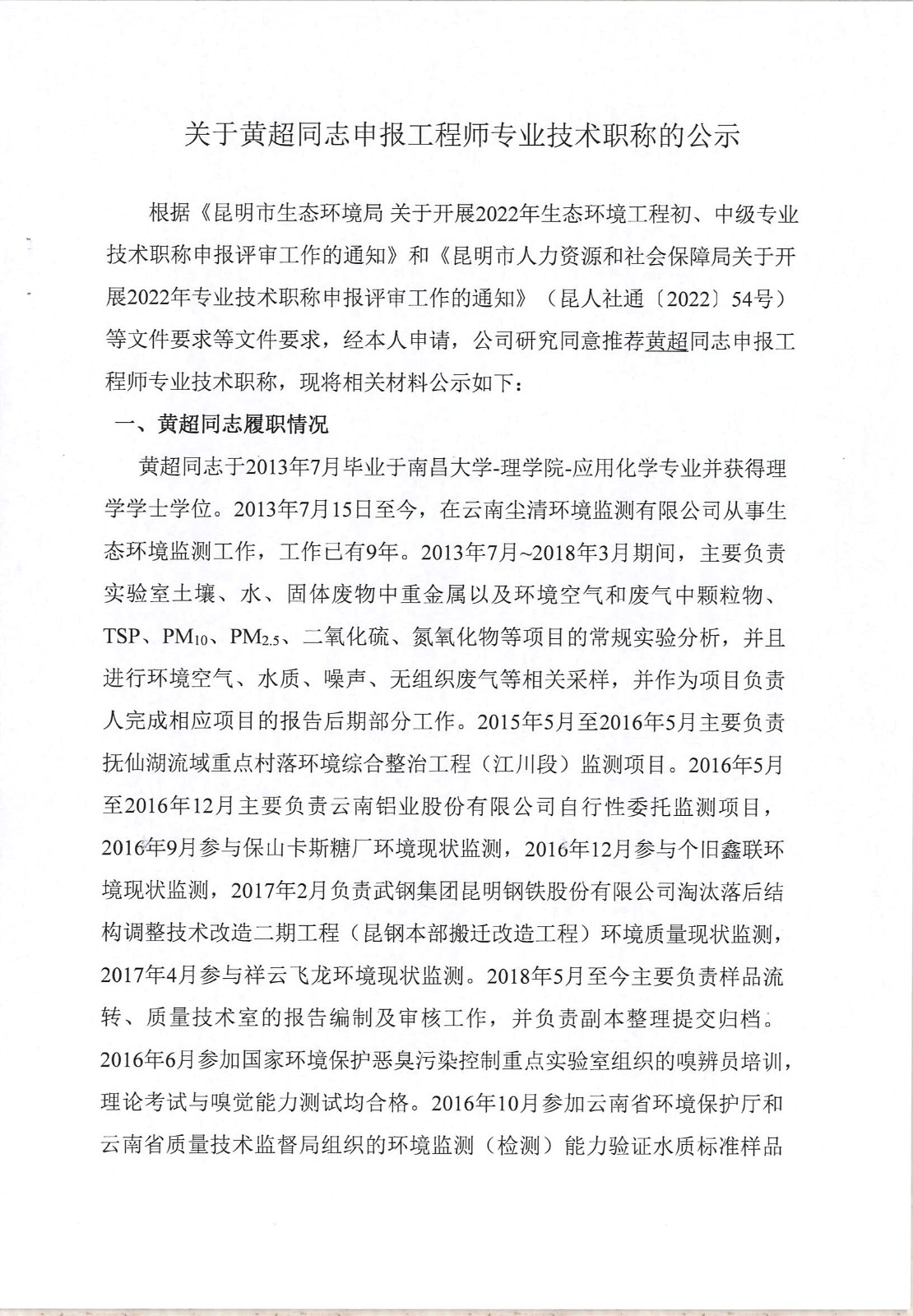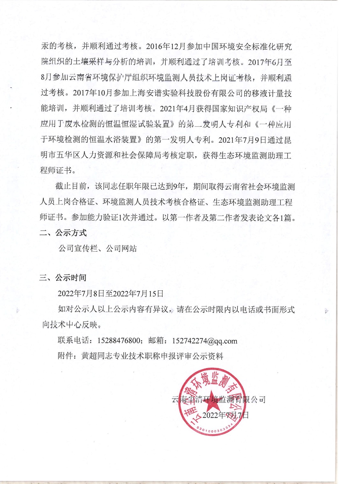 關(guān)于黃超同志申報(bào)工程師專業(yè)技術(shù)職稱的公示(公示時(shí)間:2022年7月8至7月15日)