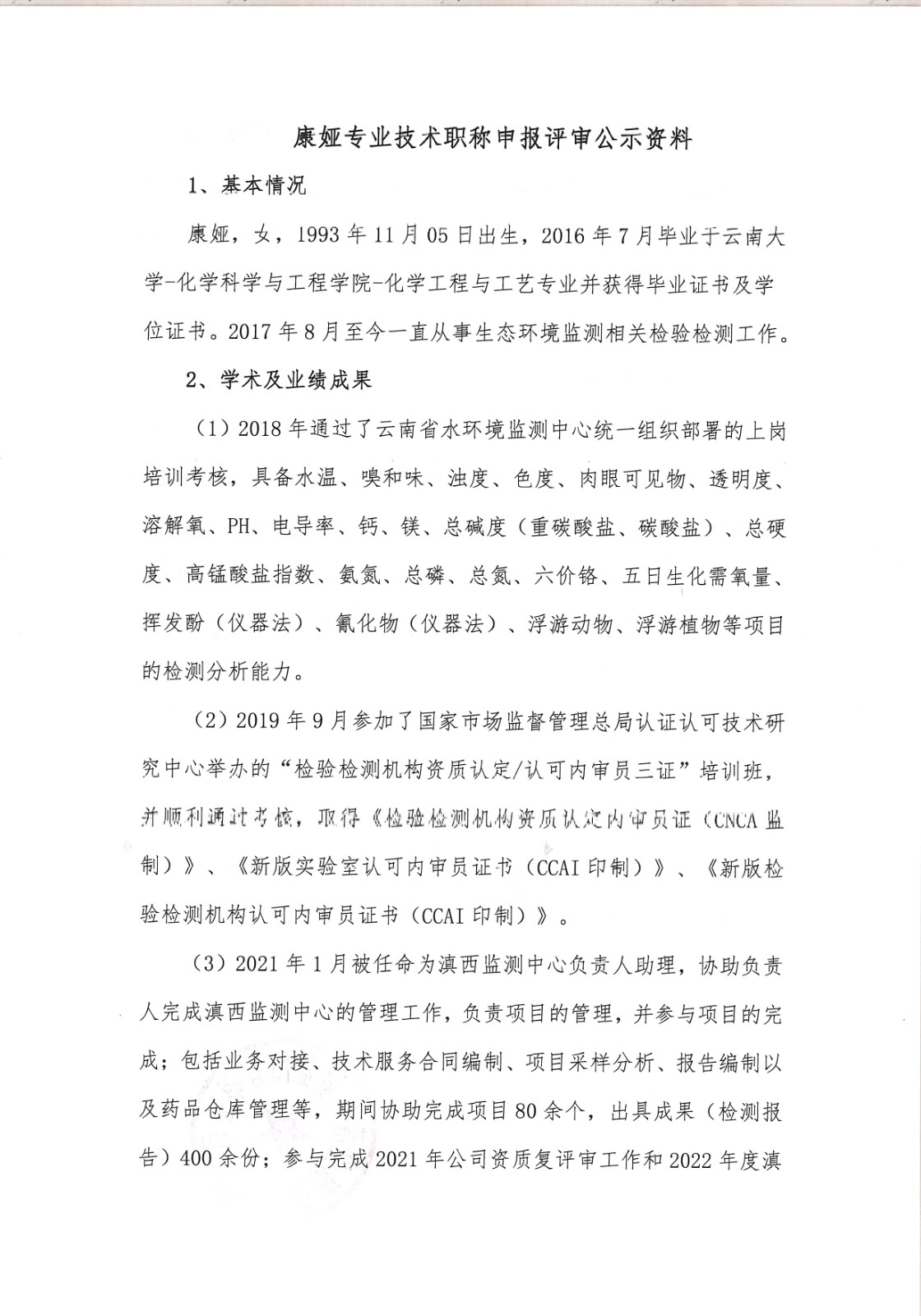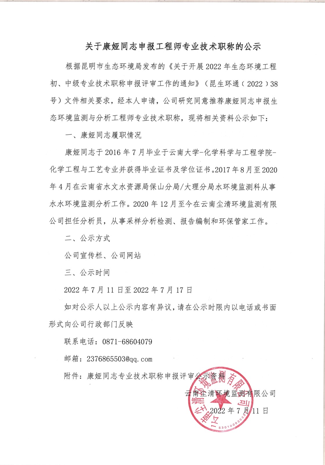 關(guān)于康婭同志申報(bào)工程師專業(yè)技術(shù)職稱的公示(公示時間:2022年7月11日至7月17日)